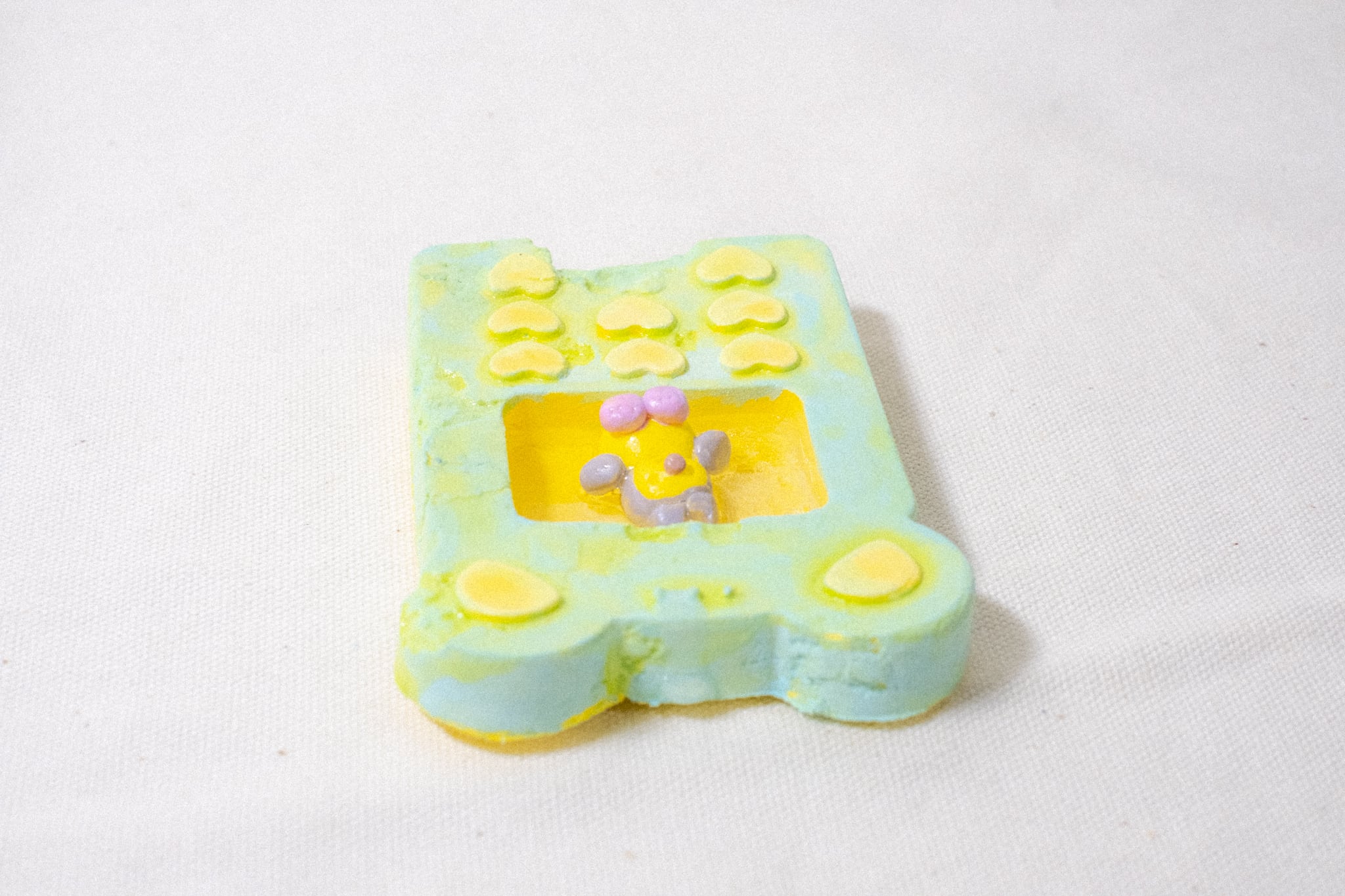 素材:樹脂粘土、アクリル絵の具、レジン、ニス